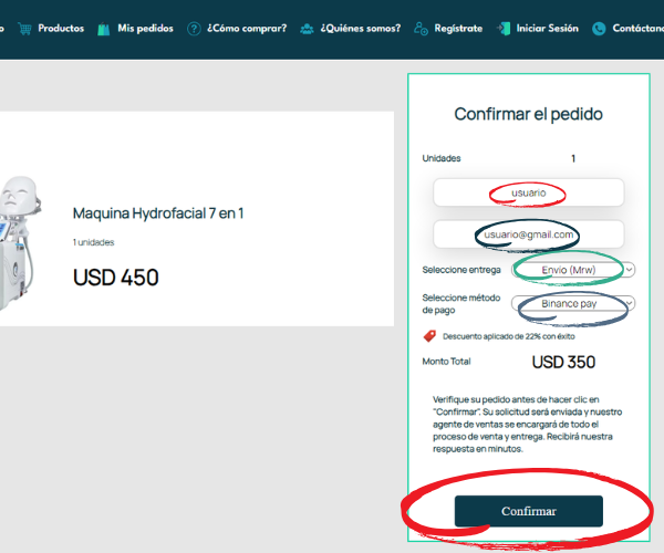 Confirmamos que todos nuestros que nuestros datos esten bien. Seleccionamos el "tipo de entrega", nuestro "metodo de pago" y luego confirmamos.